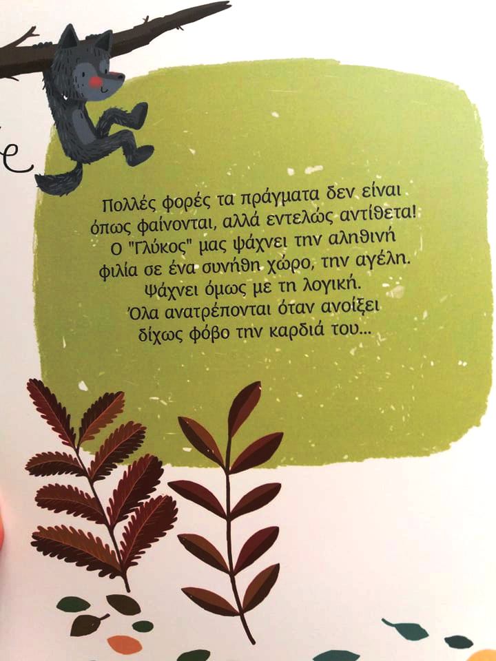 ‘Ο «κακός» λύκος, μετά την περιπέτειά του με τα επτά κατσικάκια, αποκαλύπτει την πραγματική του …. ταυτότητα. Η φυγή του από την αγέλη που πίστευε ότι ανήκει, σηματοδοτεί μια νέα περίοδο στην περιπετειώδη ζωή του. Ένα παραμύθι που περιγράφει την αναπάντεχη, την αληθινή φιλία, τη μοναξιά του διαφορετικού και δίνει μηνύματα αισιοδοξίας στην παιδική και την ενήλικη ψυχή.’