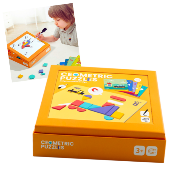 Η λογική του Μαγνητικού Παζλ Σχημάτων προέρχεται από τα παζλ Tάνγκραμ, συνδυάζοντας κοινά σχήματα όπως κύκλους, τετράγωνα κι επανεγγράψιμα ταμπλό. Τα παιδιά μπορούν να χρησιμοποιήσουν τα 46 ξύλινα κομμάτια αλλά και τον μαρκαδόρο για να δημιουργήσουν ό,τι θέλουν, ν’ αναπτύξουν απεριόριστα τη φαντασία τους, ν’ αντιληφθούν το σχήμα του αντικειμένου και στη συνέχεια να το σχεδιάσουν ή να το κατασκευάσουν. Ταυτόχρονα, μπορούν να κατανοήσουν βασικές μαθηματικές έννοιες όπως το μήκος, το μέγεθος, το σχήμα, ο συνδυασμός σχημάτων και η ποσότητα. Ο πίνακας σχεδίασης καλύπτεται με ένα εξαιρετικά λεπτό φιλμ PET όπου τα παιδιά μπορούν να σβήσουν και να ξαναγράψουν δεκάδες χιλιάδες φορές. Οι κάρτες έχουν σχεδιαστεί με αυξανόμενο βαθμό δυσκολίας, από εύκολες σε δύσκολες, πράγμα το οποίο αναπτύσσει βήμα προς βήμα τη σκέψη των παιδιών. Περιέχεται μαρκαδόρος λευκοπίνακα. Διαστάσεις: 24.5 x 22.5 x 11 εκ.