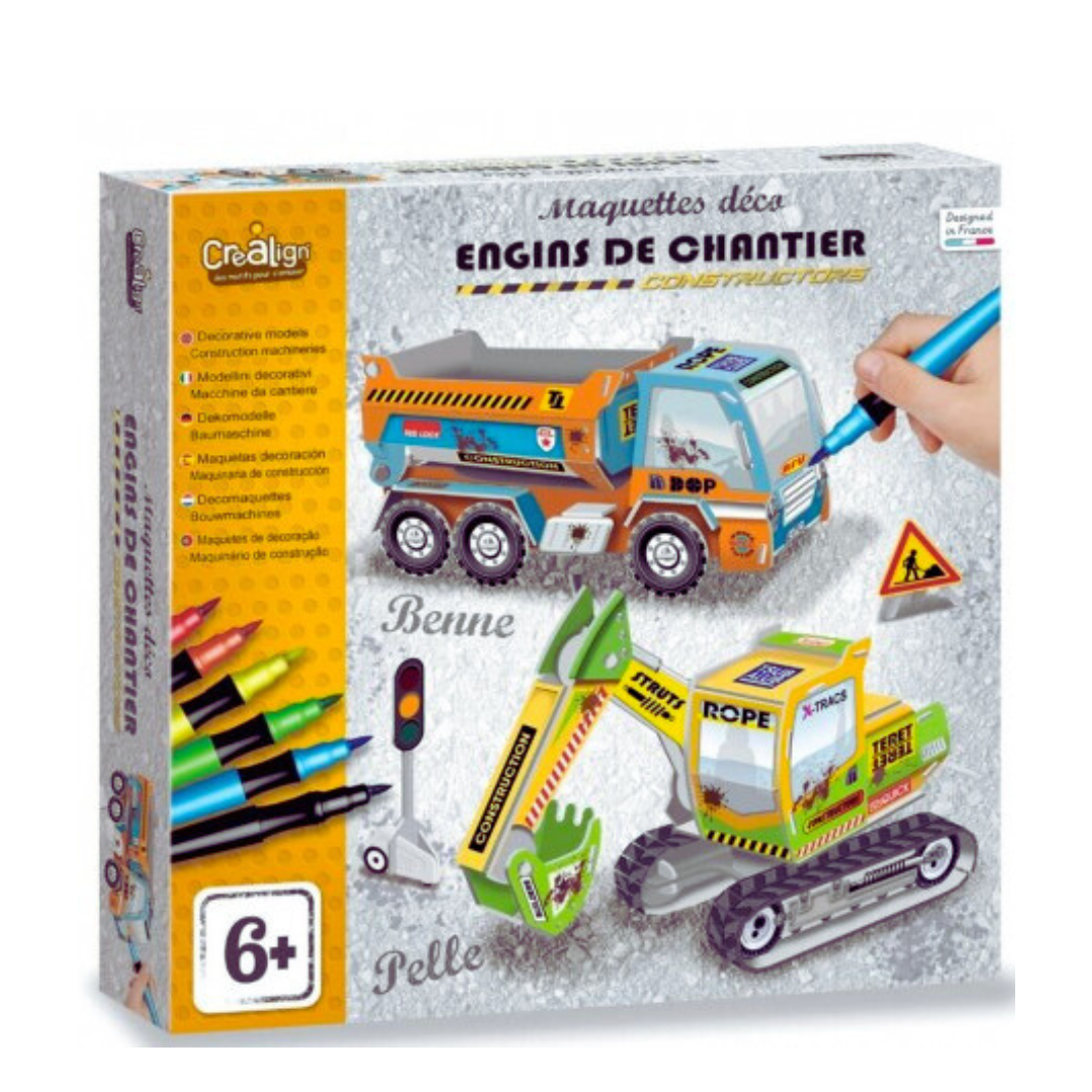 Τα παιδιά θα μπορούν να συναρμολογήσουν και να εξατομικεύσουν τα μοντέλα τους από χαρτόνι. Για τους λάτρεις των μηχανημάτων κατασκευής! Χάρη σε αυτό το δημιουργικό σετ, τα παιδιά θα μπορούν να συναρμολογούν τα προ-κομμένα εξαρτήματα από χαρτόνι. Στη συνέχεια μπορούν να τα ζωγραφίσουν και να τα εξατομικεύσουν χρησιμοποιώντας τους μαρκαδόρους και τα αυτοκόλλητα που παρέχονται για να δημιουργήσουν μοναδικά μοντέλα!