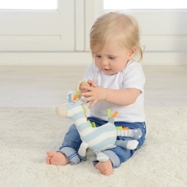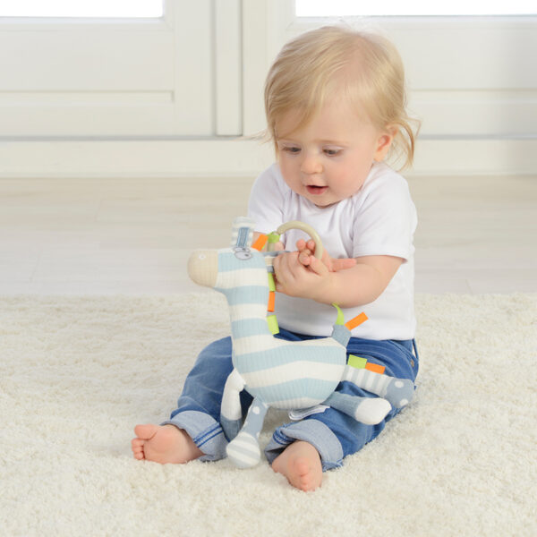 Η συγκεκριμένη κρεμαστή ζέβρα δραστηριοτήτων διαθέτει πολλά υφάσματα και κορδέλες για να τα εξερευνήσει το παιδί, ενώ περιλαμβάνει επίσης ένα μασητικό σιλικόνης σε φωτεινά χρώματα, μια κουδουνίστρα και πολλά άλλα. Διαθέτει ακόμα μια πλαστική λαβή για να την κρεμάτε στην κούνια ή το καρότσι και να την έχετε πάντα μαζί σας. Θα ενισχύσει το συντονισμό χεριού-ματιού, την επιδεξιότητα, την ακοή, τα δόντια και την υφή των παιδιών. Διαστάσεις: 7 x 21 x 27 εκ.