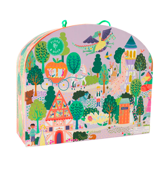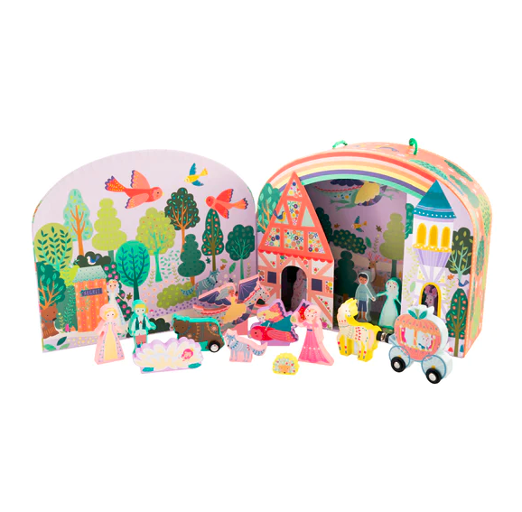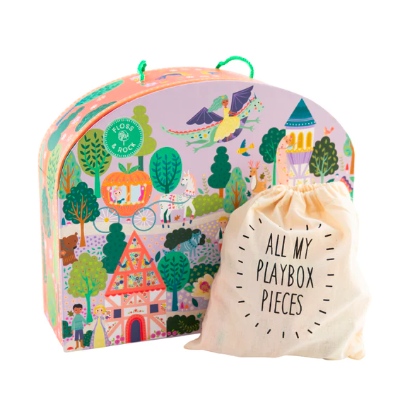 Ελάτε στον μαγεμένο κόσμο του Παραμυθιού! Το κουτί ανοίγει για να αποκαλύψει μια έντονα χρωματισμένη, εικονογραφημένη χώρα των θαυμάτων κάτω από ένα όμορφο φωτεινό ουράνιο τόξο. Ανακαλύψτε τη μυστική περιοχή του κήπου πίσω από το αχυρένιο σπίτι και τον πύργο, και που ξέρετε? -μπορεί να συναντήσετε ακόμη και έναν φιλικό δράκο να πετάει ψηλά στον ουρανό! Διασκεδάστε ώρες με πρίγκιπες, πριγκίπισσες, φίλους ζωακια και πολλά άλλα. Με 15 ποιοτικά ξύλινα κομμάτια διπλής όψης και δύο σε ρόδες, το διαμορφωμένο επαναχρησιμοποιούμενο κουτί συνοδεύεται από μια εύχρηστη λαβή μεταφοράς που το καθιστά ιδανικό για να το μεταφέρετε από μέρος σε μέρος για παραμυθένιες περιπέτειες! Όταν τελειώσει ο χρόνος παιχνιδιού, τοποθετήστε όλα τα κομμάτια σας στη βαμβακερή τσάντα με κορδόνια περίσφιξης που παρέχεται για να τα διατηρήσετε ασφαλή για την επόμενη φορά.