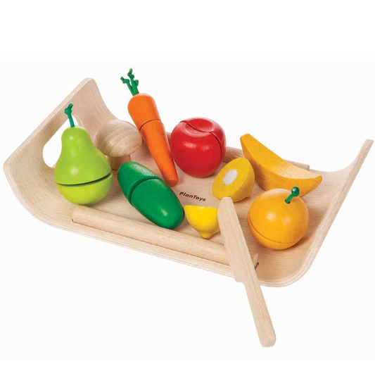 Το σετ περιλαμβάνει από ένα, μήλο, αχλάδι, λεμόνι, πορτοκάλι, μπανάνα, αγγούρι, μανιτάρι, καρότο, μαχαίρι και ένα δίσκο.