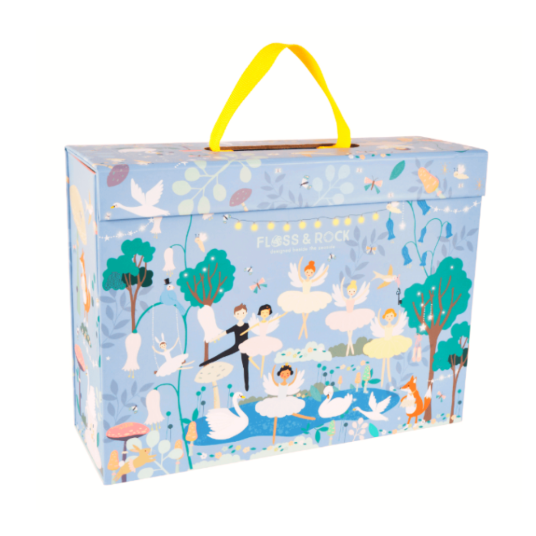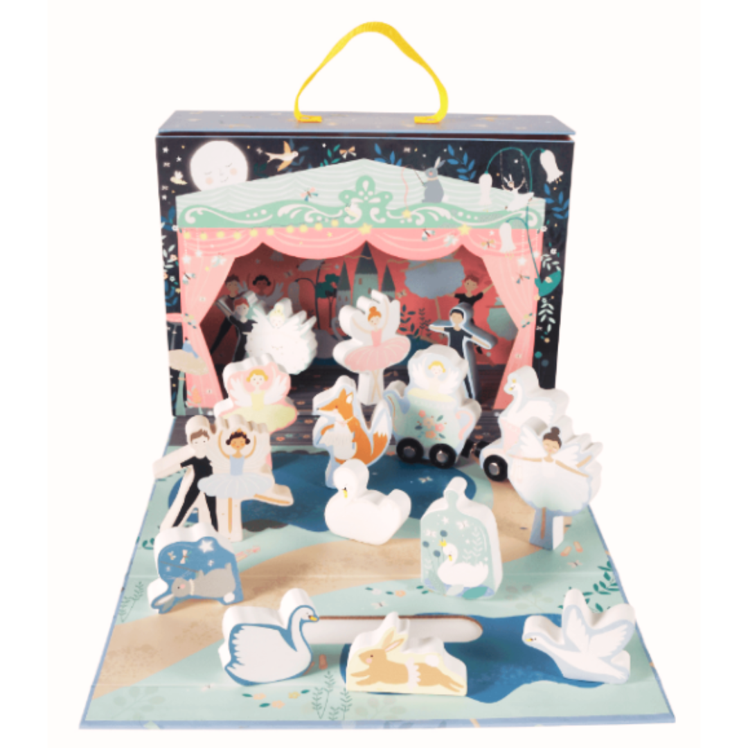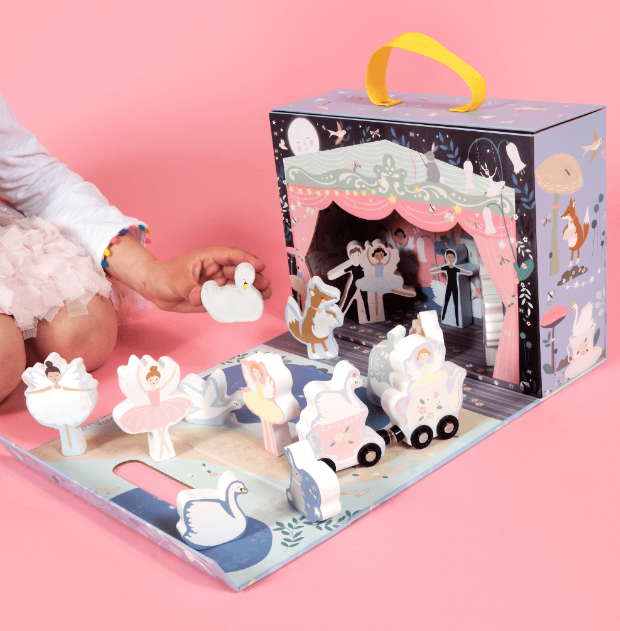 Είναι ένα όμορφο παιχνίδι ρόλου σε βαλιτσάκι με θέμα το μπαλέτο. Ένα υπέροχο κουτί που ανοίγει και διπλώνει για να αποκαλυφθεί η σκηνή που θα πραγματοποιηθεί η παράσταση. Η συσκευασία διαθέτει 15 ξύλινα τεμάχια διπλής όψης όπως μπαλαρίνες, χορευτές, κύκνοι και πολλά άλλα, σε μια βαμβακερή σακούλα για την αποθήκευση τους. Το παιδί μπορεί να απασχοληθεί σε παιχνίδι ρόλων που αναπτύσσει τον διάλογο και την φαντασία. Μπορεί να δημιουργήσει ιστορίες και να μιμηθεί ρόλους μέσα από τις φιγούρες. Το βαλιτσάκι έχει εργονομικό σχεδιασμό και έτσι είναι εύκολη για το παιδί η μεταφορά του. . Διαστάσεις: 29 x 10 x 22 εκ.