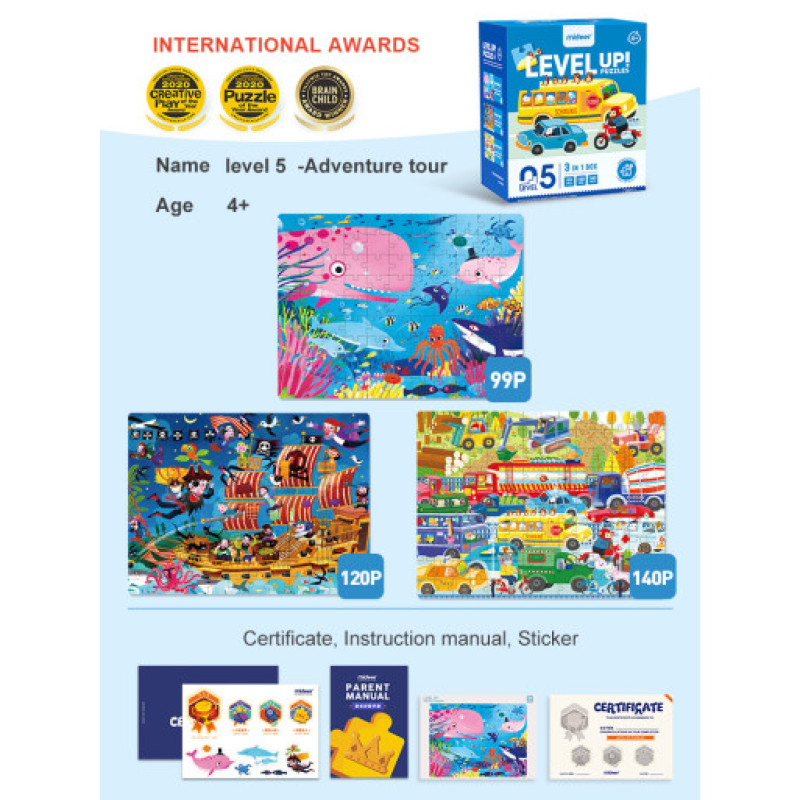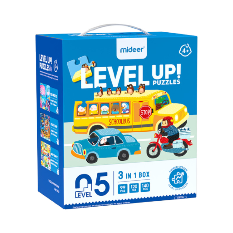 Εξελικτικό Σετ παζλ με θέμα την βόλτα! Την βόλτα στον βυθό, στην πόλη, και την βόλτα με πειρατικό καράβι! Τα παζλ της σειράς Level Up 3 σε 1, αποτελούν μοναδικά και διασκεδαστικά εκπαιδευτικά παιχνίδια. Με εντυπωσιακές εικονογραφήσεις και αυτοκόλλητα. Τα 8 επίπεδα της σειράς είναι ταξινομημένα σύμφωνα με τα επίπεδα δυσκολίας, από το πιο εύκολο έως το προχωρημένο, κάτι που θα σας βοηθήσει να αναπτύξετε τις πνευματικές δυνατότητες του παιδιού σας βήμα προς βήμα. Θα βοηθήσει επίσης στην ανάπτυξη βασικών δεξιοτήτων όπως η αναγνώριση σχήματος, η συγκέντρωση, καθορισμός στόχων και η υπομονή. Level 3 – Ανάπτυξη της τέχνης και της αισθητικής. Περιλαμβάνει 3 παζλ με 99, 120, 140 κομμάτια. Κατασκευασμένο από υλικά υψηλής ποιότητας. Βοηθά στην ενίσχυση της πρώιμης ανάπτυξης. Αποτελεί μια υπέροχη πρόταση για δώρο. Διαστάσεις συσκευασίας: 20 x 22 x 13 cm