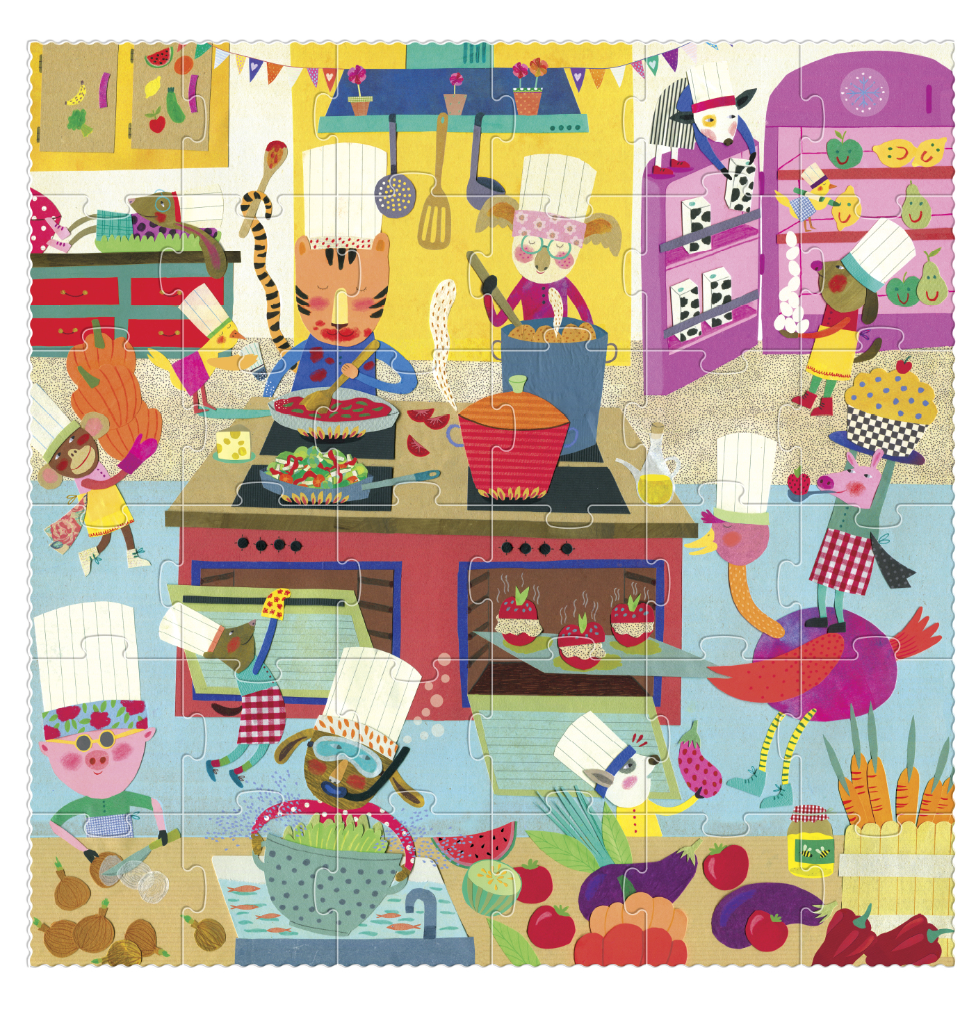 Σε αυτή την πολύχρωμη κουζίνα επίδοξοι σεφ όλων των ειδών μαγειρεύουν και ετοιμάζουν πεντανόστιμα πιάτα! Κατασκευασμένο από 100% ανακυκλωμένα υλικά και σχεδιασμένο στην Βαρκελώνη. Με υπέροχα σκίτσα από την Mariona Cabassa. Το παζλ αποτελείται από 36 τεμάχια. Διαστάσεις παζλ: 47 x 47 εκ.
