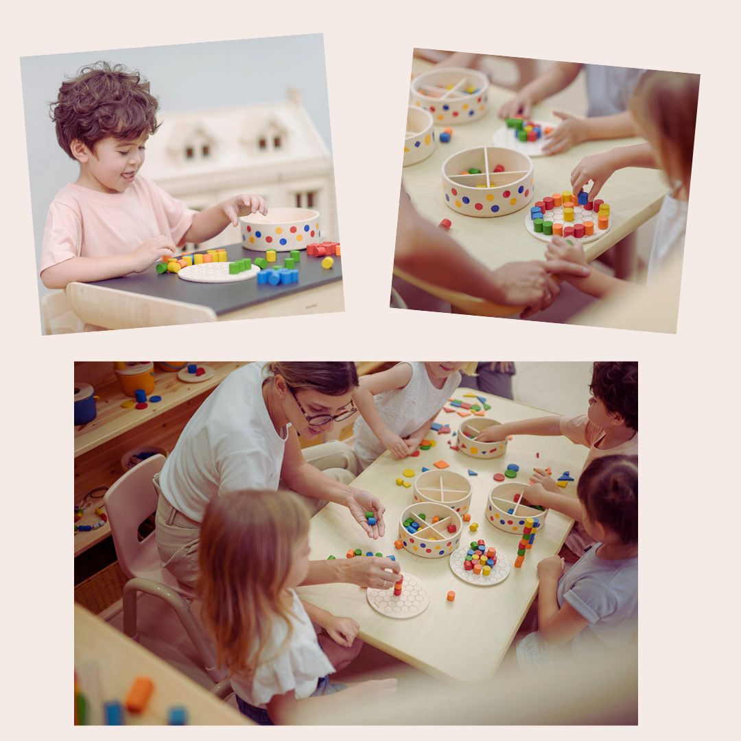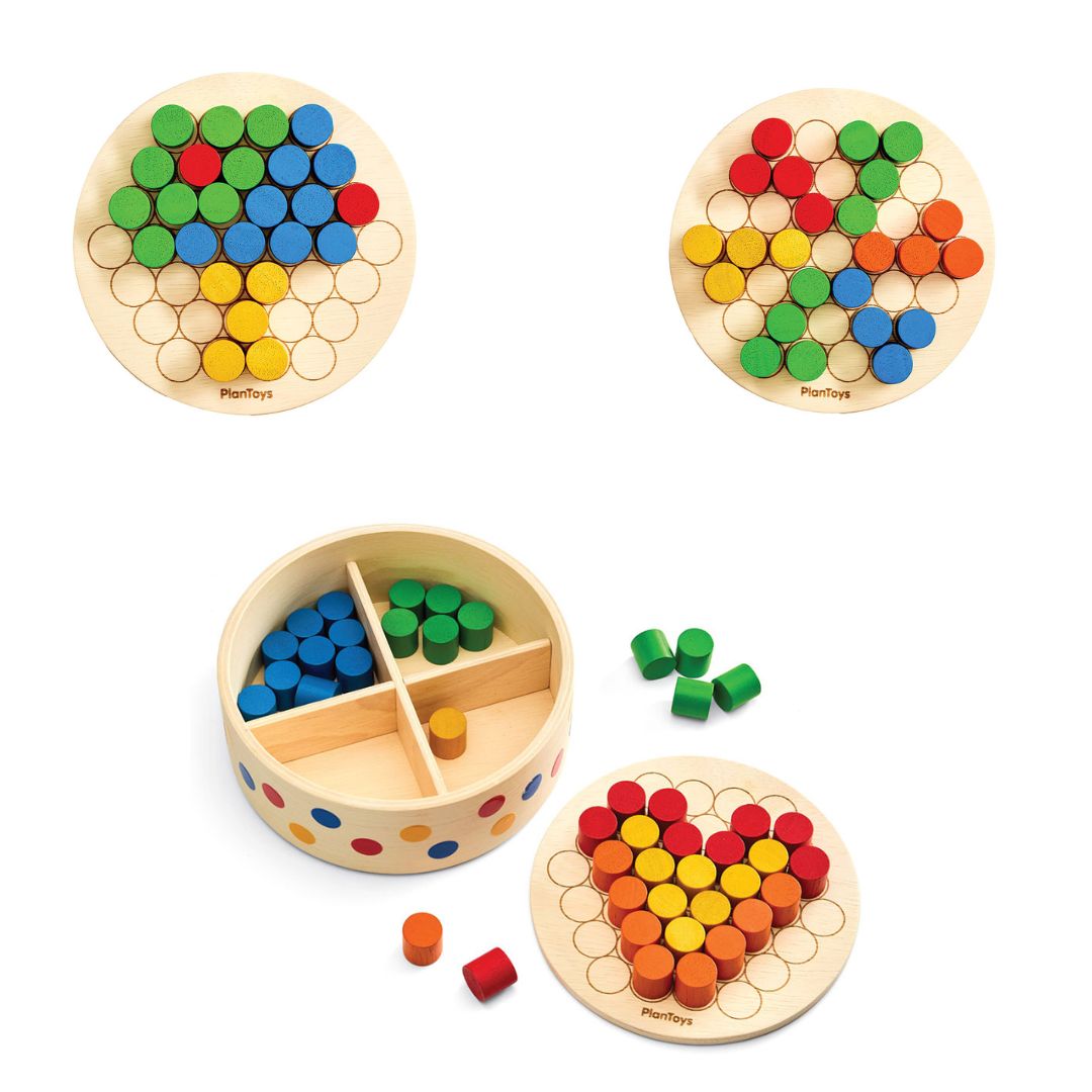 Ενισχύει τη δημιουργικότητα, τη συστηματική σκέψη και τις λεπτές κινητικές δεξιότητες καθώς τα παιδιά τοποθετούν χρωματιστά πασαλάκια δημιουργώντας τρισδιάστατα σχέδια και μοτίβα. Η δραστηριότητα καλλιεργεί τον συντονισμό χεριού-ματιού, την ευελιξία των δακτύλων και τις πρώτες μαθηματικές δεξιότητες μέσω της ταξινόμησης χρωμάτων, συμμετρίας και ακολουθιών. Οι κυκλικοί οδηγοί στον πίνακα βοηθούν στην ακριβή τοποθέτηση των πασαλακίων, δίνοντας στα παιδιά τη δυνατότητα να σχεδιάζουν ελεύθερα, να ακολουθούν πρότυπα, να ταξινομούν ανά χρώμα, να μετρούν και να εξασκούν βασικές μαθηματικές έννοιες. Η συσκευασία λειτουργεί και ως κουτί αποθήκευσης για εύκολη οργάνωση. Το σετ περιλαμβάνει: 1 ξύλινο στρογγυλό ταμπλό με 37 υποδοχές (χαραγμένες και στις δύο πλευρές) και 45 χρωματιστά πασαλάκια (9 σε κάθε χρώμα: κόκκινο, μπλε, πράσινο, κίτρινο, πορτοκαλί).