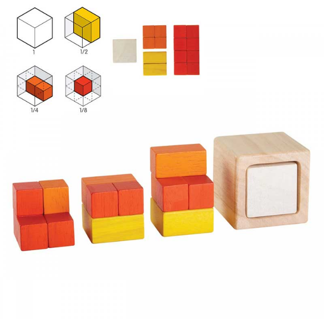 Αυτό το πολύχρωμο βασικό σετ κύβων βοηθάει τα παιδιά να εξερευνήσουν και να συγκρίνουν τα κλάσματα. Μαθαίνουν την έννοια της αναλογίας μεταξύ του τμήματος και του συνόλου, ενώ παράλληλα αναπτύσσουν την μαθηματική τους σκέψη.