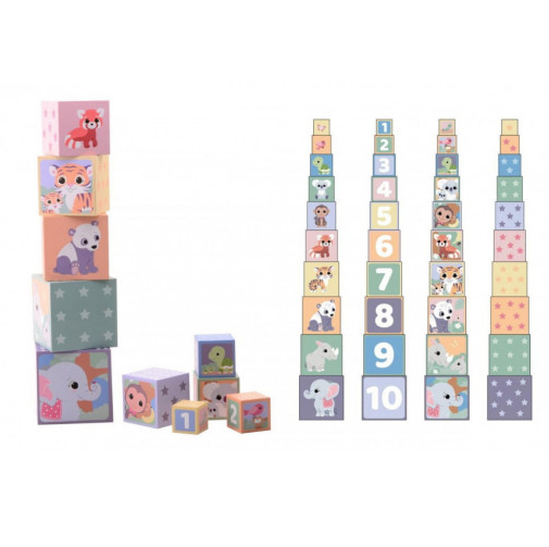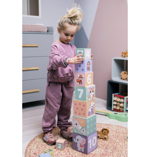 Αυτοί οι κύβοι ταξινόμησης σε παστέλ χρωματισμούς θα κρατήσουν τους μικρούς μας φίλους απασχολημένους, βελτιώνοντας παράλληλα τη δεξιότητα της ισορροπίας και το συντονισμό χεριού-ματιού. Σχηματίστε έναν πύργο από κύβους 86 εκατοστών και παρατηρήστε τις μοναδικές ζωγραφιές με ζωάκια και αριθμούς, που περιβάλουν τις πλευρές τους. Κατάλληλο για παιδιά ηλικίας 18 μηνών και πάνω.