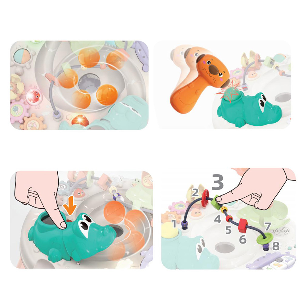 Χαρακτηριστικά: 3 Διαδραστικά παιχνίδια με μπάλα. Εμπειρία ζούγκλας. 9 διαφορετικές δραστηριότητες ανακάλυψης. Εφέ φωτός/ Χαρούμενο πιάνο ιπποπόταμος. Παιχνίδι με μπάλες: Κροκόδειλος. Πολύχρωμες χάντρες: Ο καμπυλωτός στύλος έχει μια σειρά από πολύχρωμες χάντρες με διαφορετικά σχήματα. Βοηθά να μάθετε στο μικρό σας να μετράει και να καταγράφει πόσες μπάλες έχουν πέσει στο τραπέζι. Off-low/high volume. Απαιτεί μπαταρίες 3 x 1,5V ”AA” (Δεν περιλαμβάνονται).