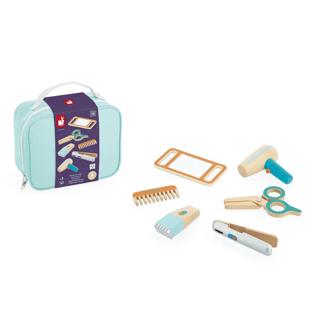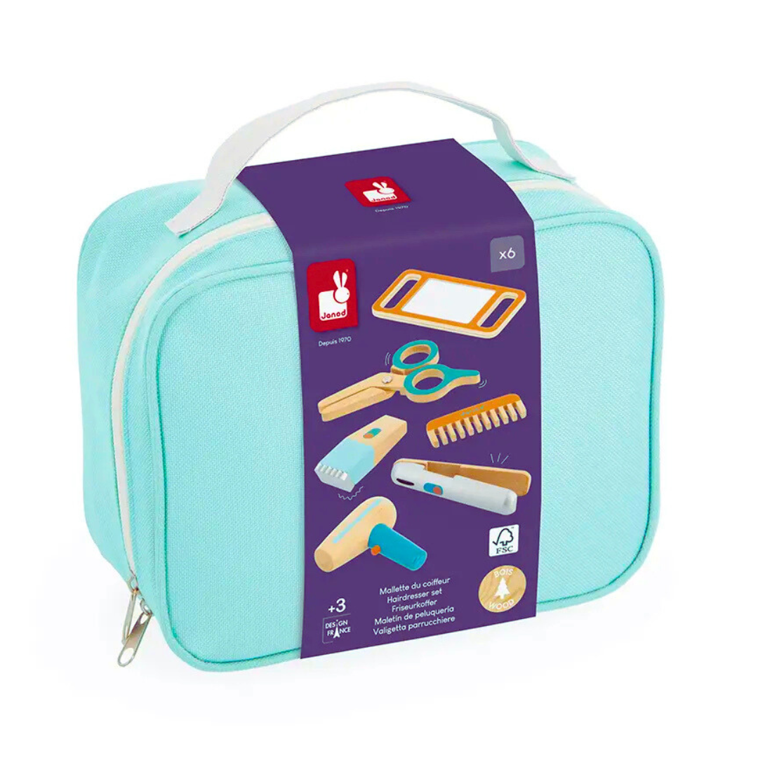 Ώρα για ένα κουρεματάκι; Αυτή η ελκυστική θήκη περιλαμβάνει μια ισιωτική πρέσα, μια τσατσάρα, ένα ψαλίδι, έναν καθρέφτη, ένα πιστολάκι και ένα ξυραφάκι – όλα όσα χρειάζεστε για να μιμηθείτε τον αγαπημένο σας κομμωτή! Μόλις τελειώσει το παιχνίδι, και τα 6 αξεσουάρ του σετ τακτοποιούνται στην εντέλεια μες στη θήκη, η οποία είναι εύκολη στη μεταφορά χάρη στις υφασμάτινες λαβές της. Ένα υπέροχο αληθοφανές παιχνίδι που θα τροφοδοτήσει τη φαντασία του παιδιού σας. Χρώματα υδάτινης βάσης. Κατασκευασμένο από ξύλο πιστοποιημένο από το Συμβούλιο Διαχείρισης των Δασών (FSCTM). Αληθοφανές παιχνίδι!