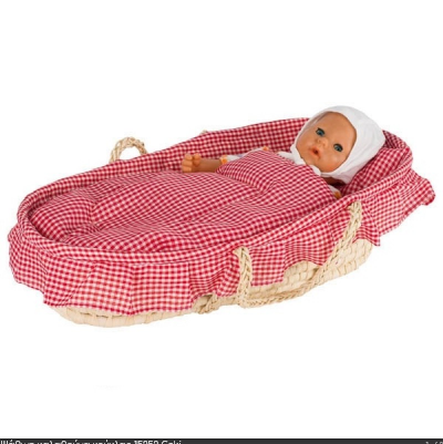 Πανέμορφη καλαθούνα κατασκευασμένη από ψάθα για να μεταφέρεις την αγαπημένη σου κούκλα όπου θέλεις. Διαθέτει δύο πρακτικά χερούλια, εσωτερικά υφασμάτινη καρώ επένδυση, στρώμα, μαξιλάρι και πάπλωμα. Κατάλληλη για κούκλες μέχρι 52cm. Η κούκλα δεν περιλαμβάνεται. Διαστάσεις: 58 x 33 x 15 εκ